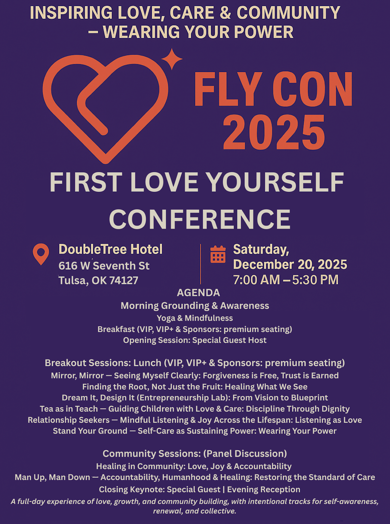 The First Love Yourself Conference (FLY Con) was born from one timeless truth — when love heals, community thrives. FLY Con is more than an event; it’s a restorative movement that calls individuals, couples, coworkers, and families back to love, which begins with purpose and overflows into emotional maturity, self-understanding, and community care. We believe that when people heal, families stabilize. When families stabilize, communities thrive.